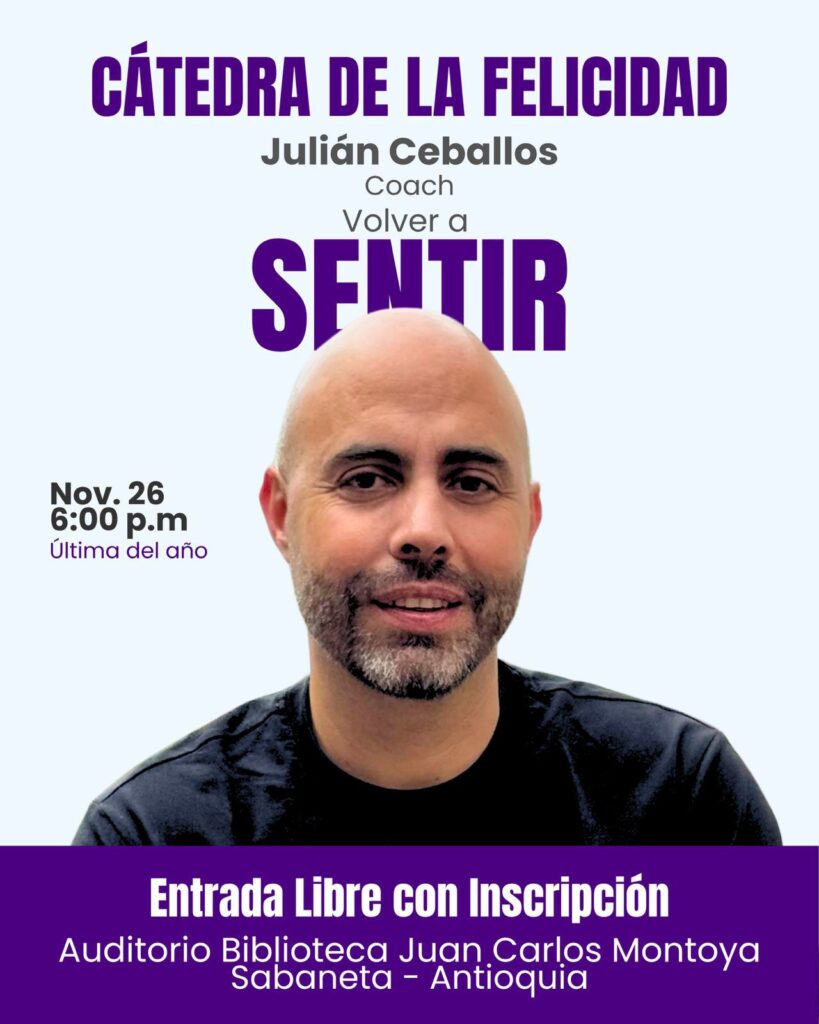 Sabaneta vive este miércoles 26 de noviembre una noche especial con la última sesión de la Cátedra de la Felicidad 2025. Desde las 7:00 p.m., el auditorio de la Biblioteca Municipal Juan Carlos Montoya, en su cuarto piso, es el escenario de “Volver a Sentir”, la charla dirigida por el coach y escritor Julián Ceballos. […]