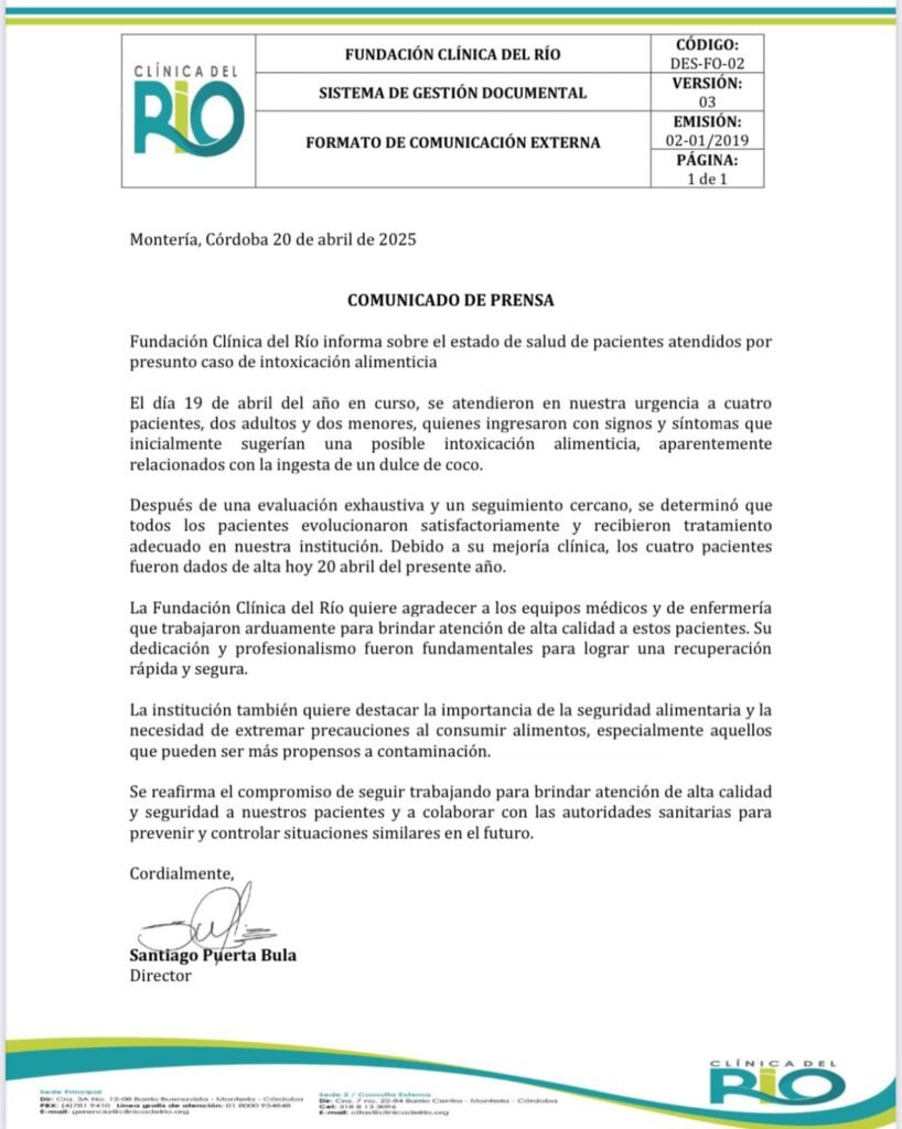 Tras una evaluación exhaustiva y tratamiento adecuado, los pacientes evolucionaron satisfactoriamente y fueron dados de alta al día siguiente. “La Fundación Clínica del Río quiere agradecer a los equipos médicos y de enfermería que trabajaron arduamente para brindar atención de alta calidad a estos pacientes. Su dedicación y profesionalismo fueron fundamentales para lograr una recuperación rápida y segura”, indicó la institución en el boletín firmado por su director, Santiago Puerta Bula.
