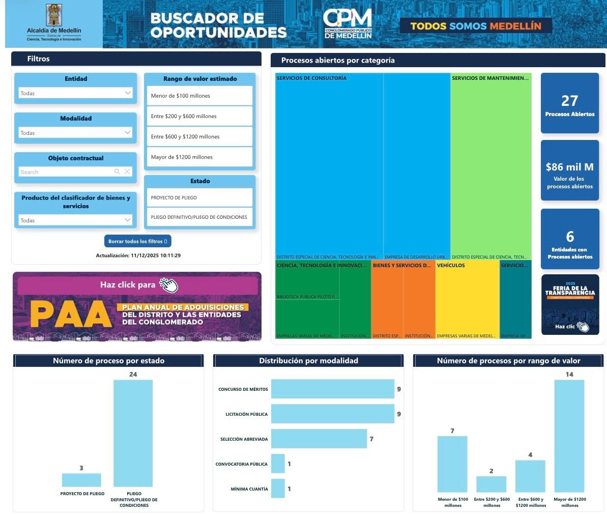 El Buscador de Oportunidades del Distrito de Medellín, la herramienta que permite consultar en un solo lugar todos los procesos de contratación pública, alcanzó un nuevo hito este año: entre el 1 de enero y el 30 de noviembre de 2025 se publicaron 1.139 procesos que suman más de $2 billones. Este espacio, disponible en la página de la Alcaldía, se ha convertido en un referente para aumentar la transparencia y recuperar la confianza de la ciudadanía en cómo se gestionan los recursos públicos.