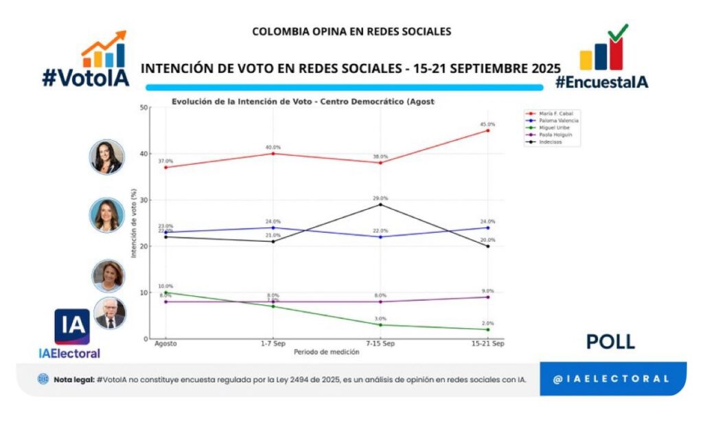 La senadora María Fernanda Cabal alcanzó su mayor cifra hasta el momento en la encuesta digital #VotoIA, al subir del 38% al 45% en la medición realizada entre el 15 y el 21 de septiembre. Con este resultado, amplía la ventaja frente a sus competidores y se consolida como la principal opción dentro del Centro Democrático.