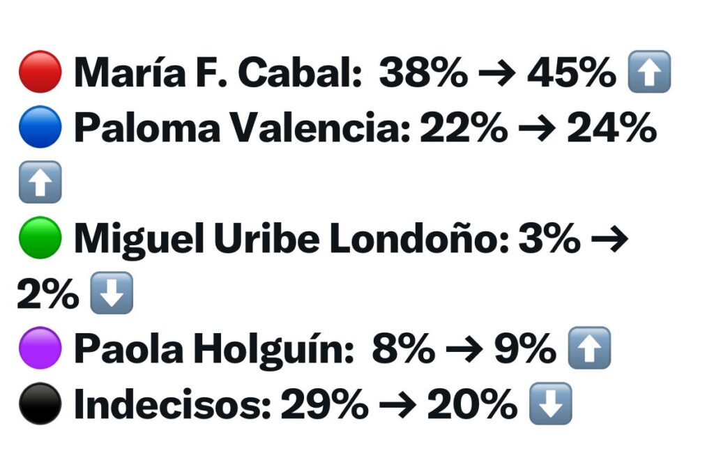 Cabal llega a su mejor registro y toma distancia como la gran favorita, mientras Paloma Valencia repunta y se afianza en el segundo lugar; en contraste, Miguel Uribe Londoño se hunde y pierde protagonismo, Paola Holguín crece un punto aunque sin mayor impacto, y la caída de los indecisos confirma que la base uribista empieza a definirse con mayor claridad.