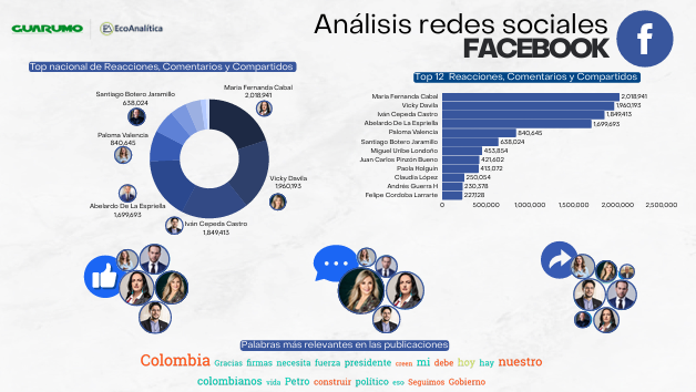 El informe destaca que María Fernanda Cabal encabeza la actividad en Facebook, con más de dos millones de interacciones en el último mes, confirmando su fuerte conexión con audiencias conservadoras.
